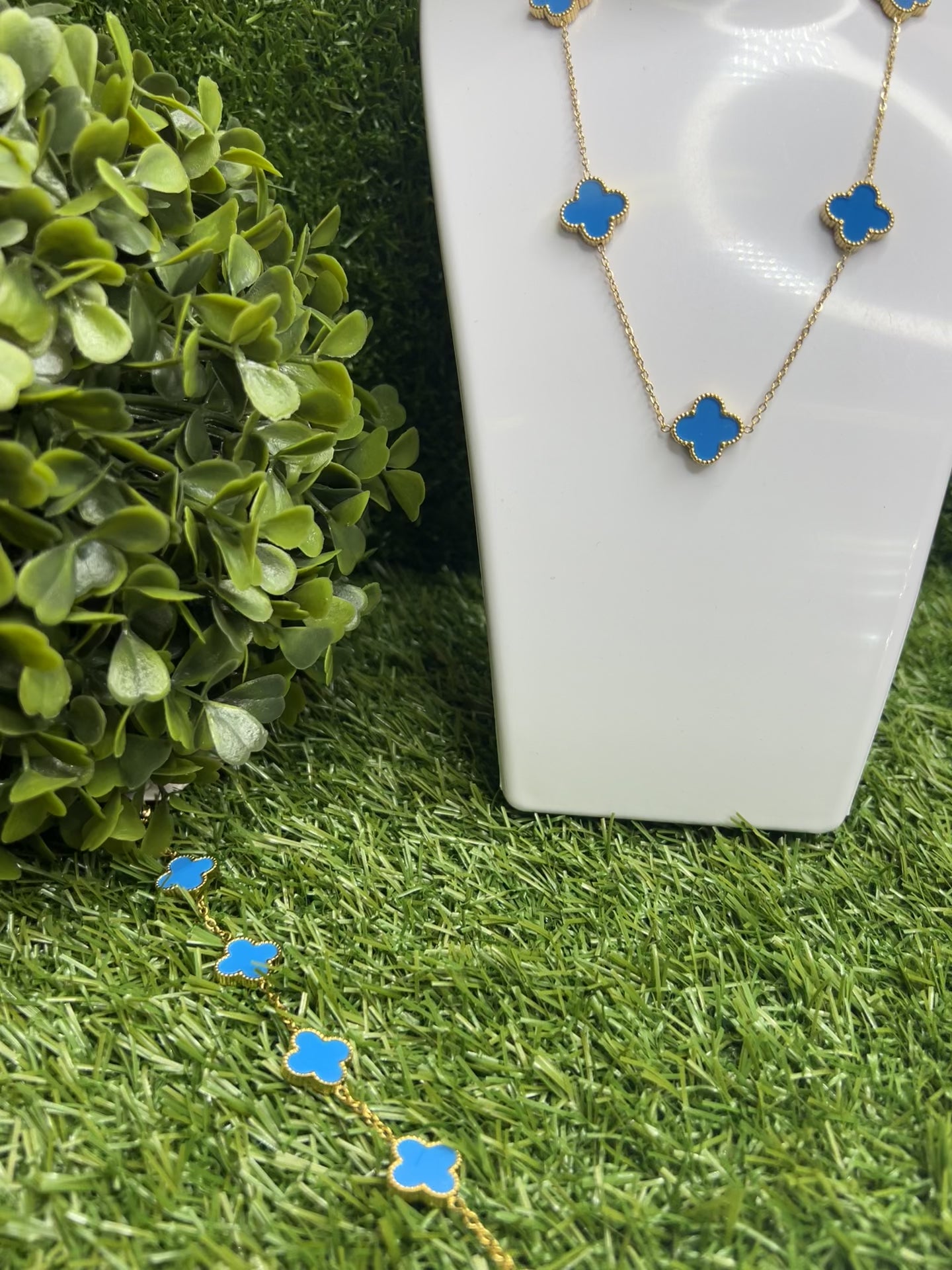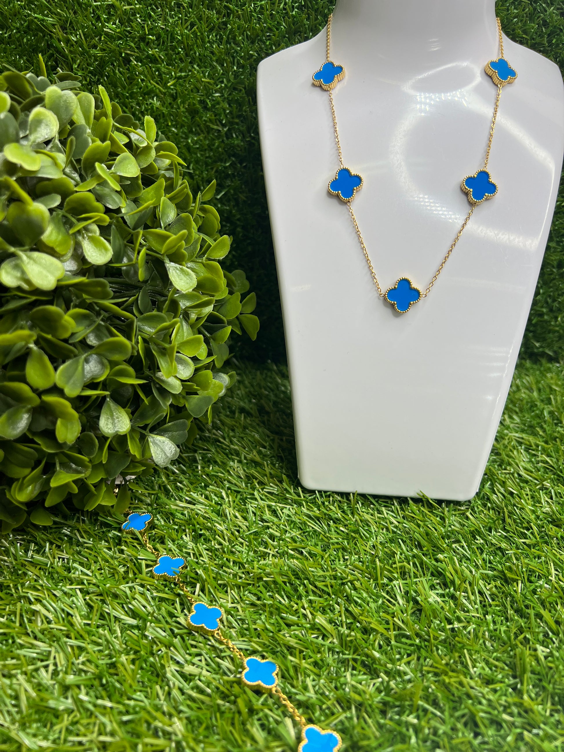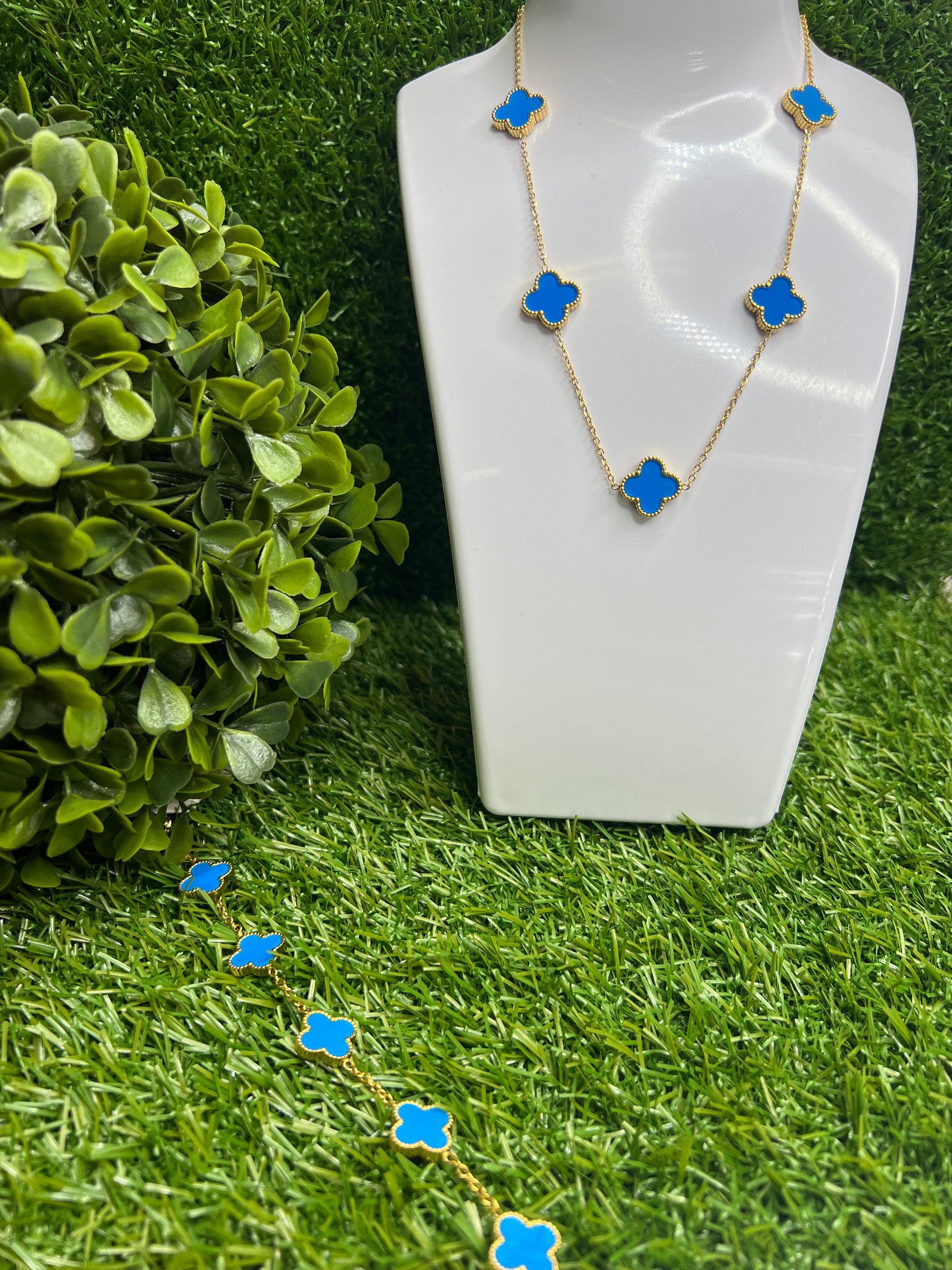 Our 14k Clover Accessories highlighted in blue & gold.