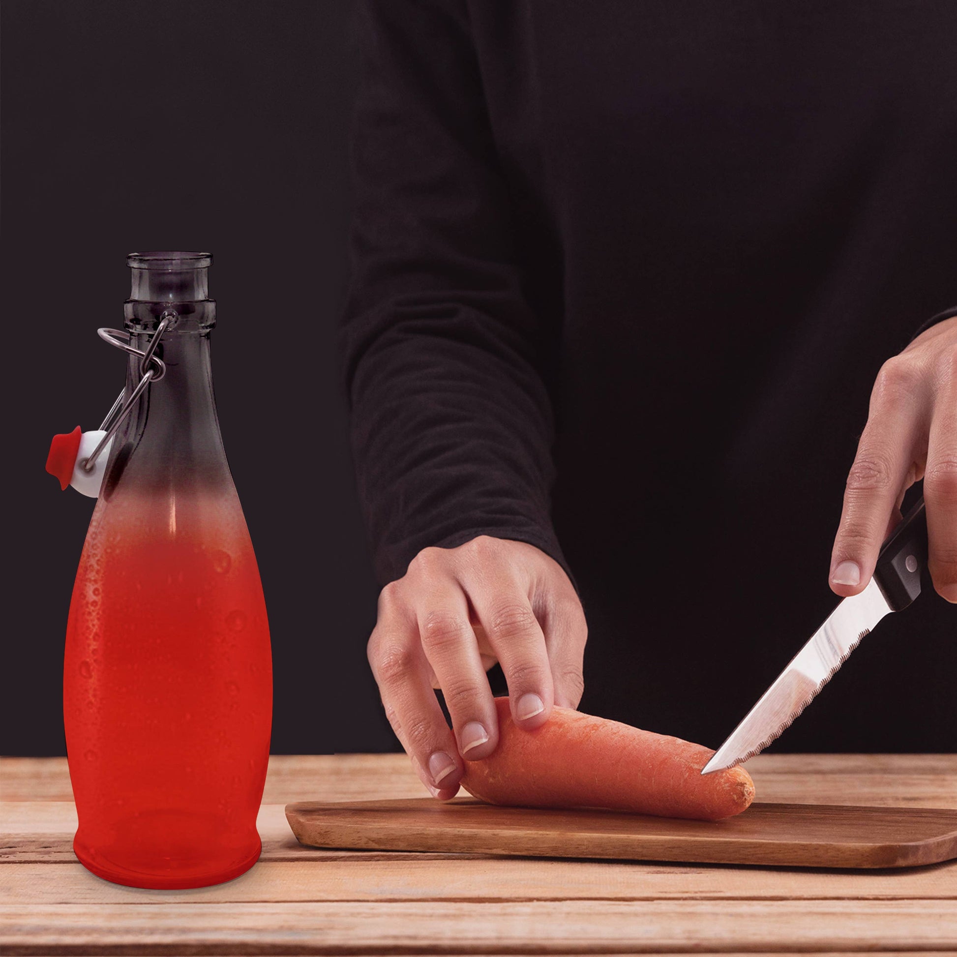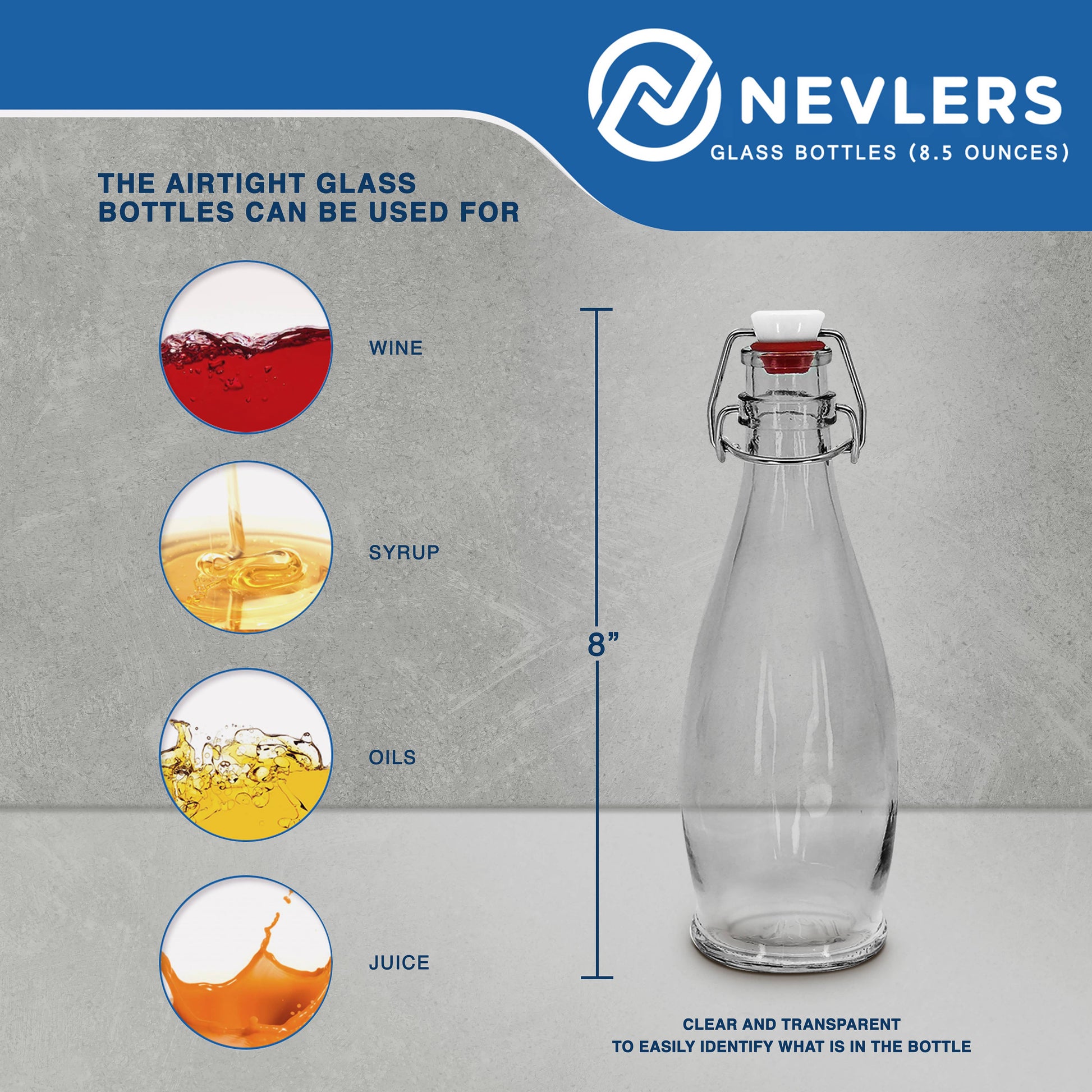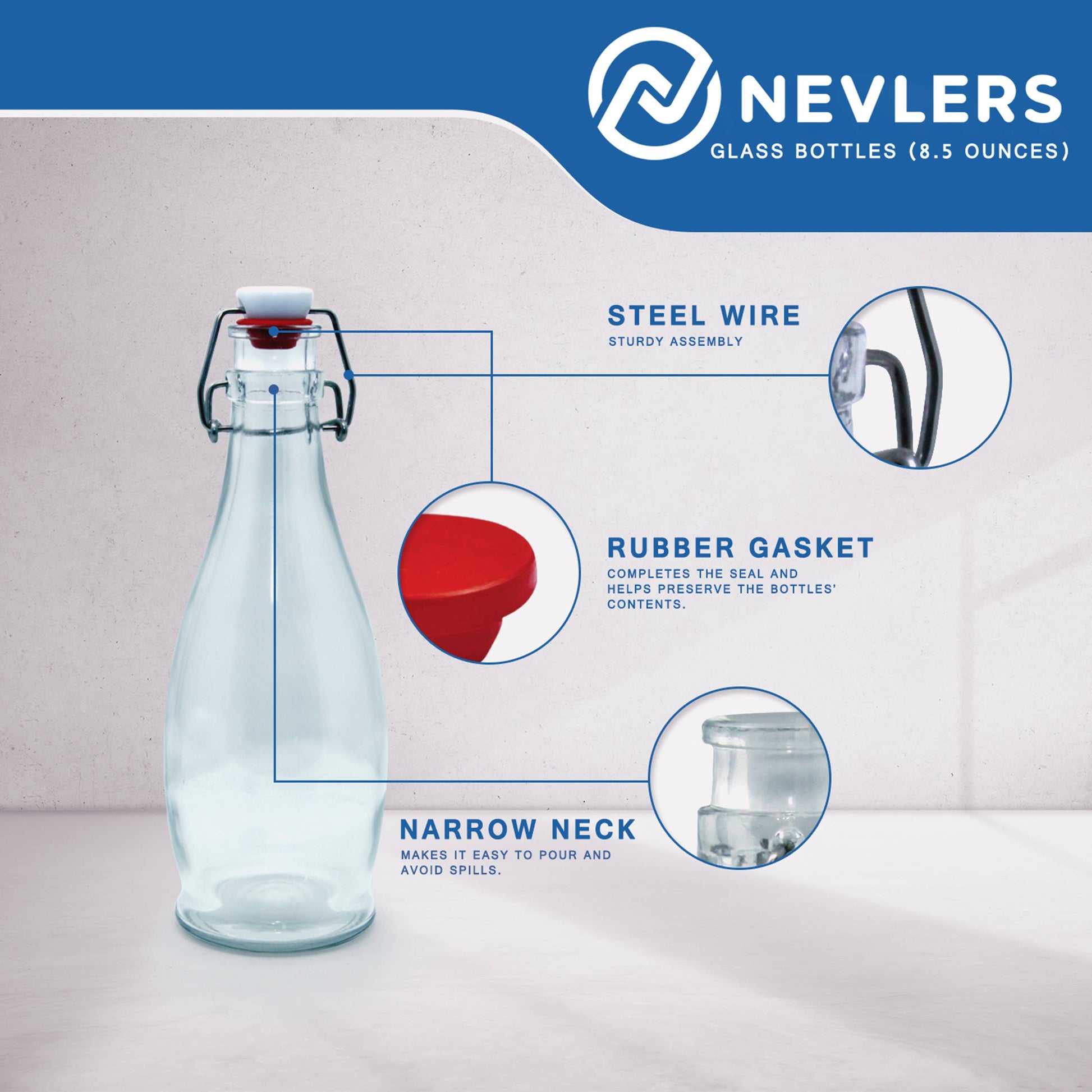The Nevlers 8.5 Oz. Glass Bottles are a convenient option for storing infused oils, homebrews, juices and more! Designed with a thick rubber gasket and steel wire clamp to secure the seal and preserve the bottles' contents; these 12 narrow-neck clear glass bottles are sure to meet all your bottling needs. The included erasable gold marker allows you to label the bottles by writing on the glass. The other accessories include a collapsible funnel for easy, clean filling and a bottle brush for quick handwashing. These water bottles can also be placed in the dishwasher, once the wire caps are removed.